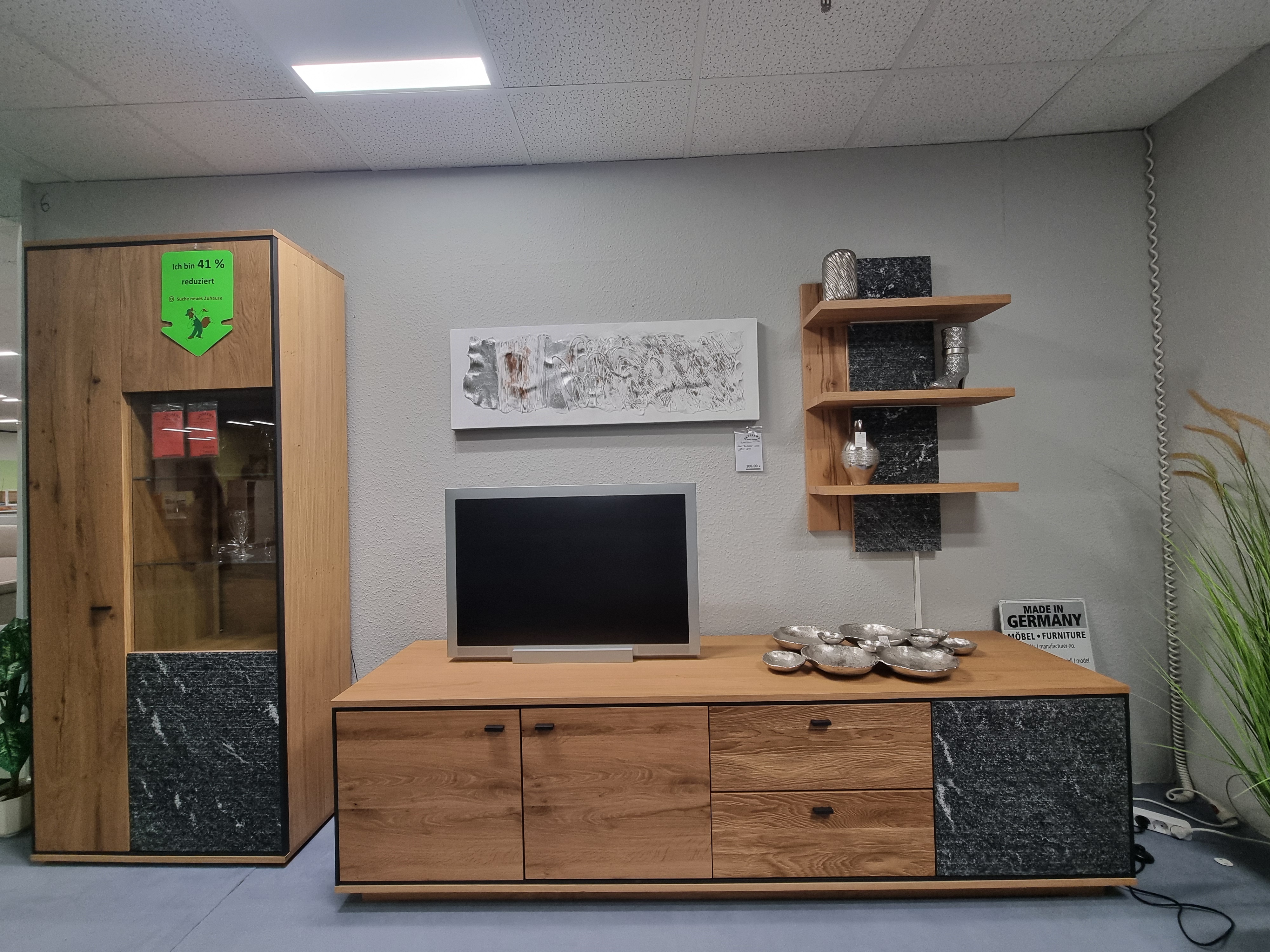 Verwandeln Sie Ihren Wohnbereich mit dieser exklusiven Wohnwand in eine luxuriöse Wohlfühloase. Die faszinierende Kombination aus warmer Eiche und edler Steinoptik ist ein absoluter Hingucker, der exzellentes "Made in Germany"-Design in Ihr Zuhause bringt. Erleben Sie herausragende Qualität und natürliche Materialien, die eine einzigartige und gemütliche Atmosphäre schaffen.